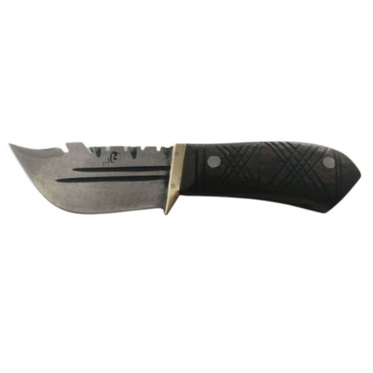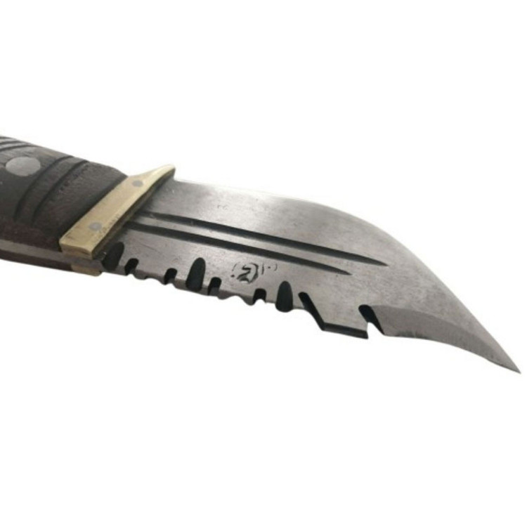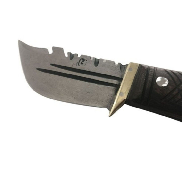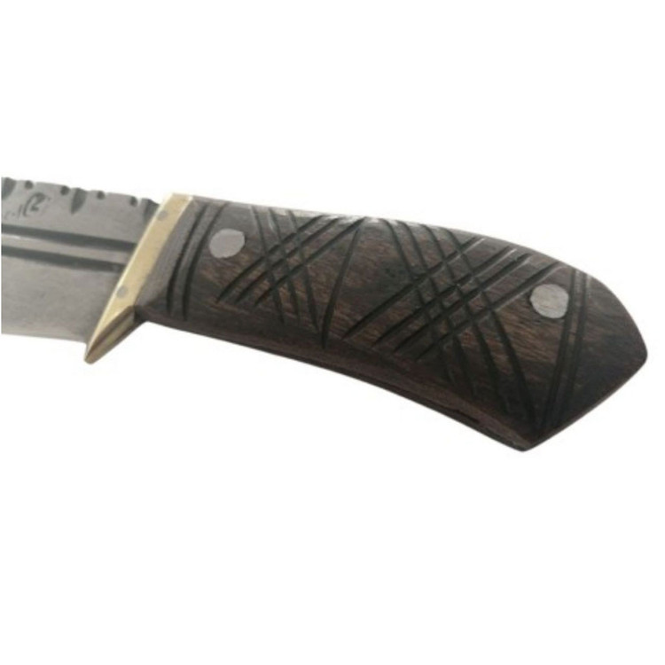 جنس تیغه فولاد فنر و جنس دسته چوب جنگلی است .دارای باربند برنجی و تیغه حالت بادامی دارد. دارای غلاف
